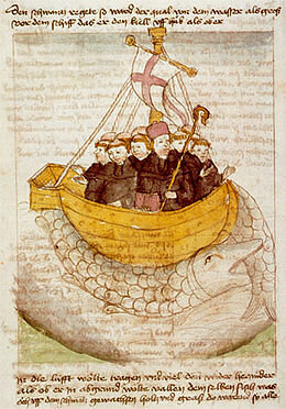 Wonder 3: Ze voerden verder naar zee en ze zagen een eiland. Ze waren een vuur aan het maken en hakten een boom om. De grond onder hen schudde en schoot omlaag. Ze staan niet op een eiland maar op de rug van een vis! De monniken en de sint konden net op tijd op het schip springen en ze voeren verder.